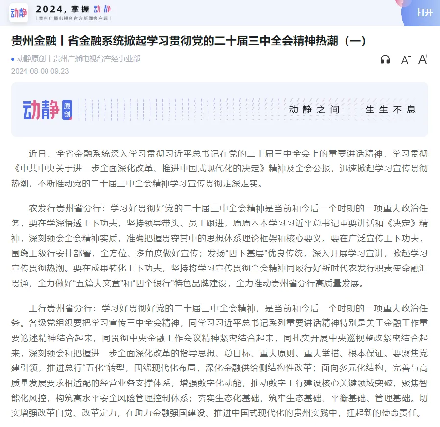 工行贵州省分行:学习好贯彻好党的二十届三中全会精神,是当前和今后一个时期的一项重大政治任务。各级党组织要把学习宣传三中全会精神,同学习习近平总书记系列重要讲话精神特别是关于金融工作重要论述精神结合起来,同贯彻中央金融工作会议精神紧密结合起来,同扎实开展中央巡视整改紧密结合起来,深刻领会和把握进一步全面深化改革的指导思想、总目标、重大原则、重大举措、根本保证。要聚焦党建引领,推进总行“五化”转型,围绕现代化布局,深化金融供给侧结构性改革;面向多元化结构,完善与高质量发展要求相适配的经营业务支撑体系;增强数字化动能,推动数字工行建设核心关键领域突破;聚焦智能化风控,构筑高水平安全风险管理控制体系;夯实生态化基础,筑牢生态基础、平衡基础、管理基础。切实增强改革自觉、改革定力,在助力金融强国建设、推进中国式现代化的贵州实践中,扛起新的使命责任。