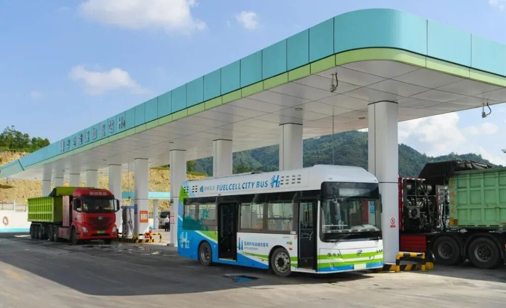 贵州美锦华宇“煤—焦—氢”综合利用示范项目上,氢能公交和氢能重卡在氢能加氢站加氢。(闻双/摄)