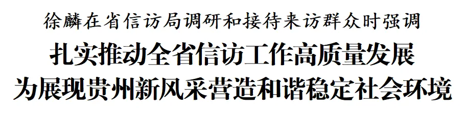 11月25日,省委书记徐麟到省信访局调研和接待来访群众。他强调,要深学笃用习近平总书记关于加强和改进人民信访工作的重要思想,深入贯彻党的二十届四中全会精神,落实省委十三届八次全会部署,坚决扛牢为民解难、为党分忧政治责任,扎实推动全省信访工作高质量发展,为展现贵州新风采营造和谐稳定社会环境。