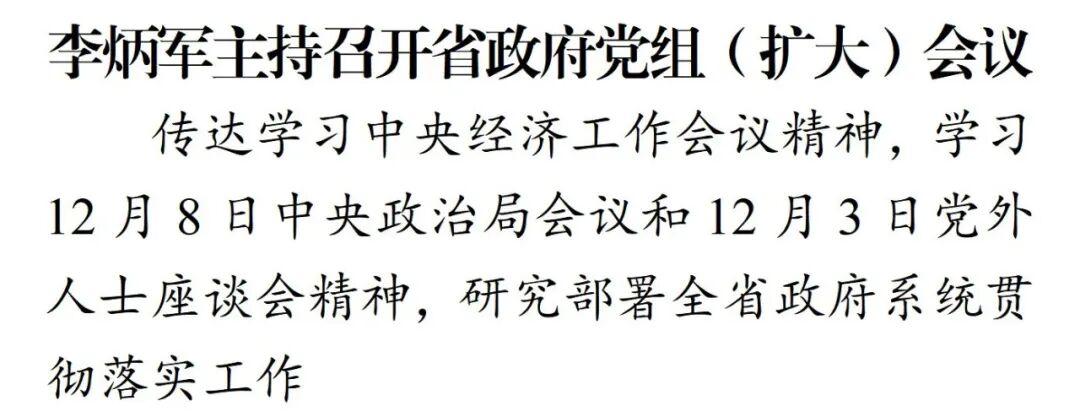 12月15日,省长、省政府党组书记李炳军主持召开省政府党组(扩大)会议,传达学习中央经济工作会议精神,学习12月8日中央政治局会议和12月3日党外人士座谈会精神,按照省委常委会会议要求,研究部署全省政府系统贯彻落实工作。省政府党组成员、副省长参加。