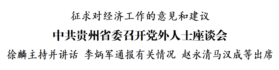12月22日,中共贵州省委召开党外人士座谈会,进一步学习贯彻中共二十届四中全会精神,深入贯彻落实中央经济工作会议精神和习近平总书记考察贵州重要讲话精神,就我省今年经济形势和明年经济工作听取各民主党派省委、省工商联负责人和无党派人士代表意见和建议。