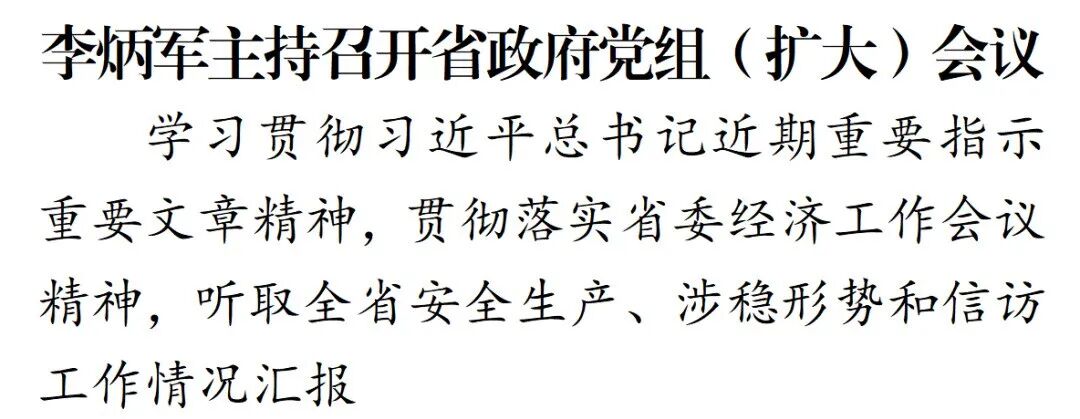12月24日,省长、省政府党组书记李炳军主持召开省政府党组(扩大)会议,深入学习贯彻习近平总书记近期重要指示重要文章精神,贯彻落实省委经济工作会议精神,听取全省安全生产、涉稳形势和信访工作情况汇报。省政府党组成员、副省长参加。