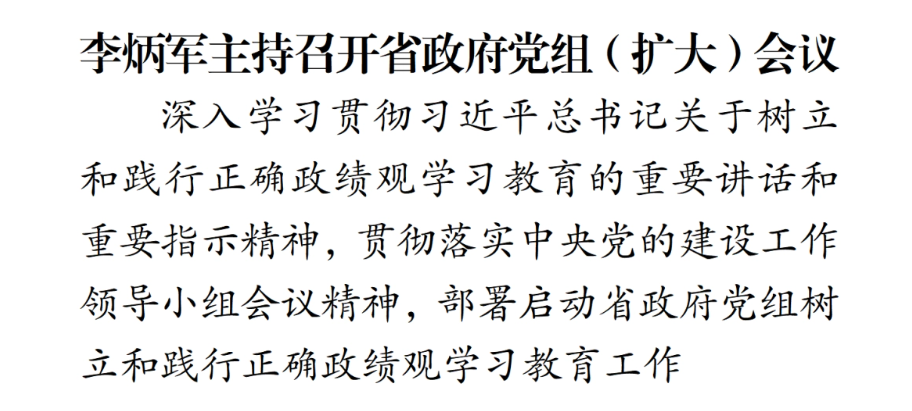 3月2日,省长、省政府党组书记李炳军主持召开省政府党组(扩大)会议,深入学习贯彻习近平总书记关于树立和践行正确政绩观学习教育的重要讲话和重要指示精神,贯彻落实中央党的建设工作领导小组会议精神,按照省委要求,部署启动省政府党组树立和践行正确政绩观学习教育工作。省政府党组成员参加。