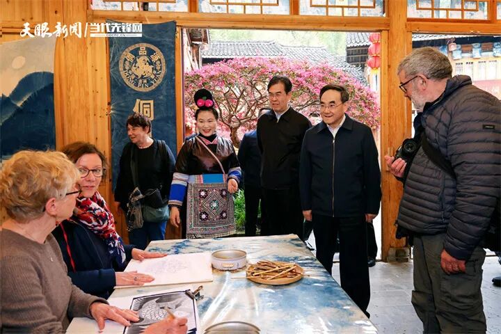图为徐麟、李炳军在肇兴侗寨蜡染工坊与务工群众交流。