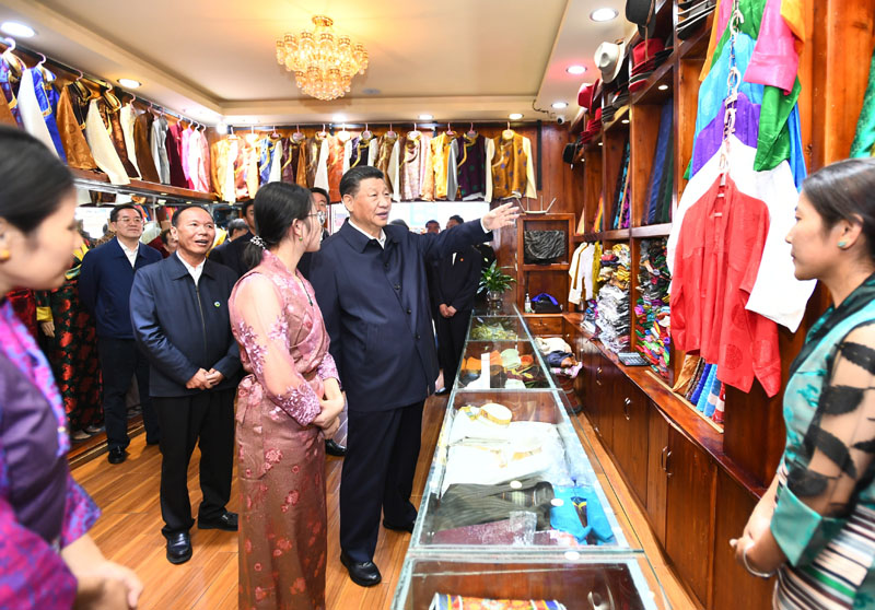 7月21日至23日,中共中央总书记、国家主席、中央军委主席习近平来到西藏,祝贺西藏和平解放70周年,看望慰问西藏各族干部群众。这是22日下午,习近平在位于拉萨市老城区的八廓街,走进特色商品店,询问旅游文创产业发展、藏文化传承保护等情况。新华社记者 谢环驰 摄