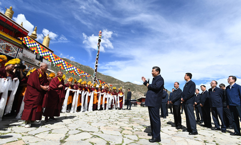 7月21日至23日,中共中央总书记、国家主席、中央军委主席习近平来到西藏,祝贺西藏和平解放70周年,看望慰问西藏各族干部群众。这是22日下午,习近平在位于拉萨西郊的哲蚌寺同僧人亲切交流。新华社记者 谢环驰 摄