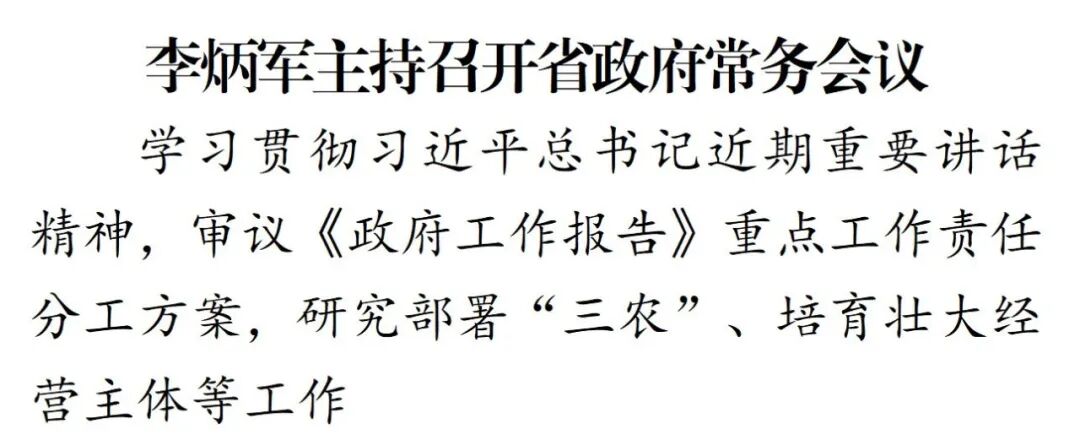 2月4日,省委副书记、省长李炳军主持召开省政府常务会议,学习贯彻习近平总书记近期重要讲话精神,审议《政府工作报告》重点工作责任分工方案,研究部署“三农”、培育壮大经营主体等工作。